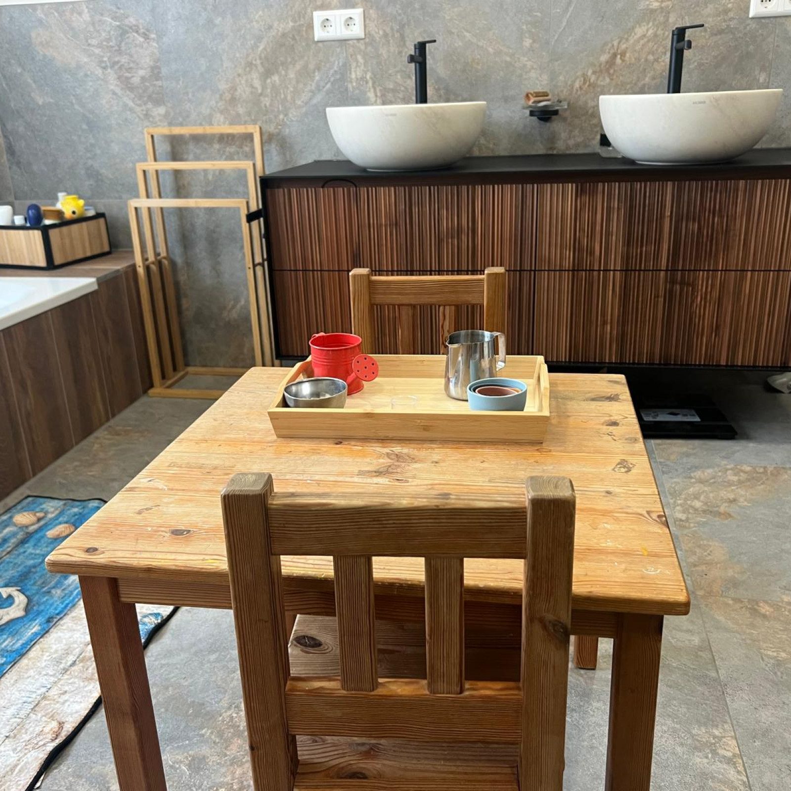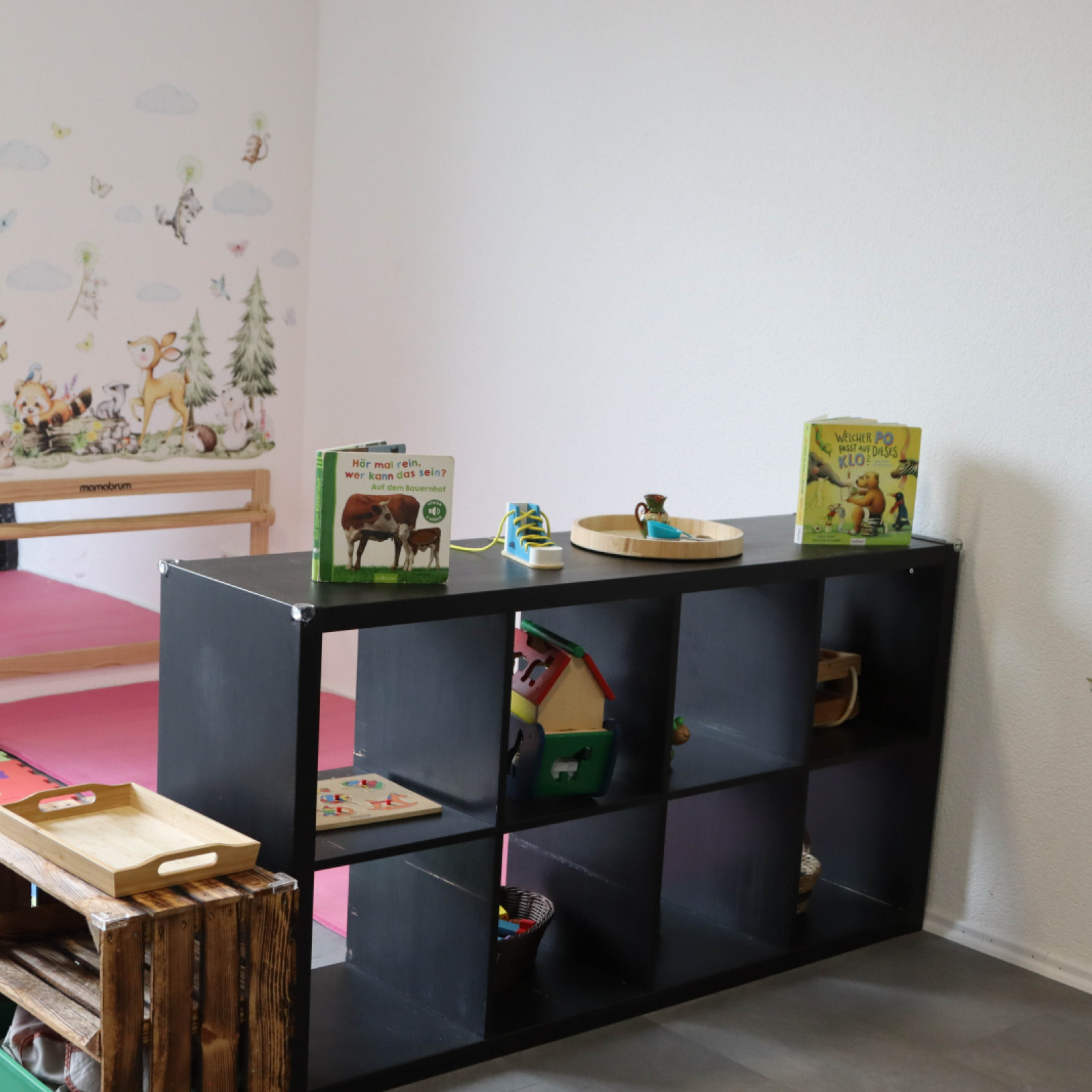 Mein Raumkonzept orientiert sich an Maria Montessori. Materialien sind niedrig und übersichtlich angeordnet, um selbstständiges Entdecken zu fördern.